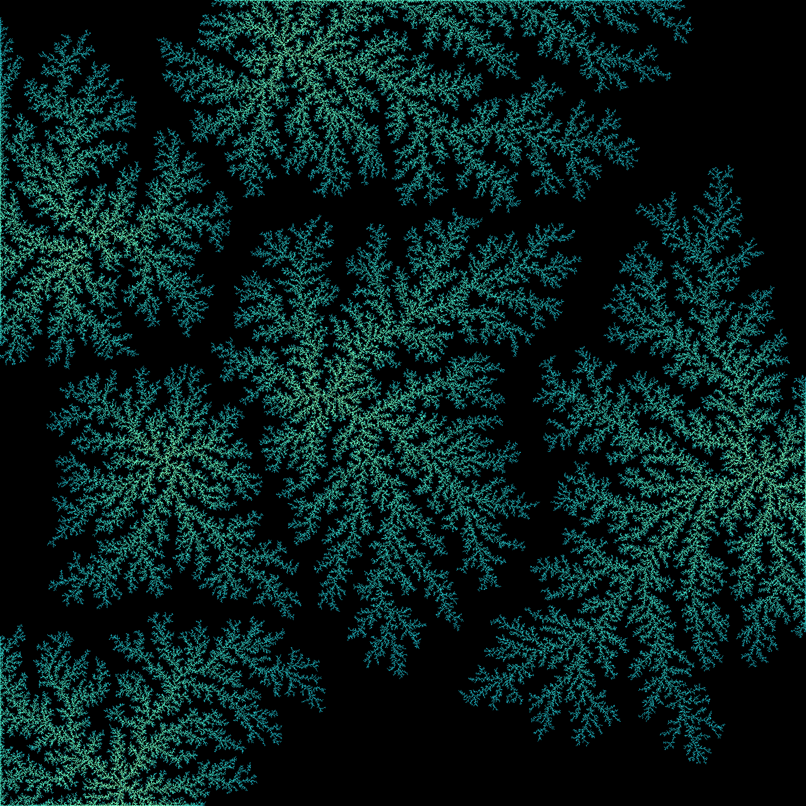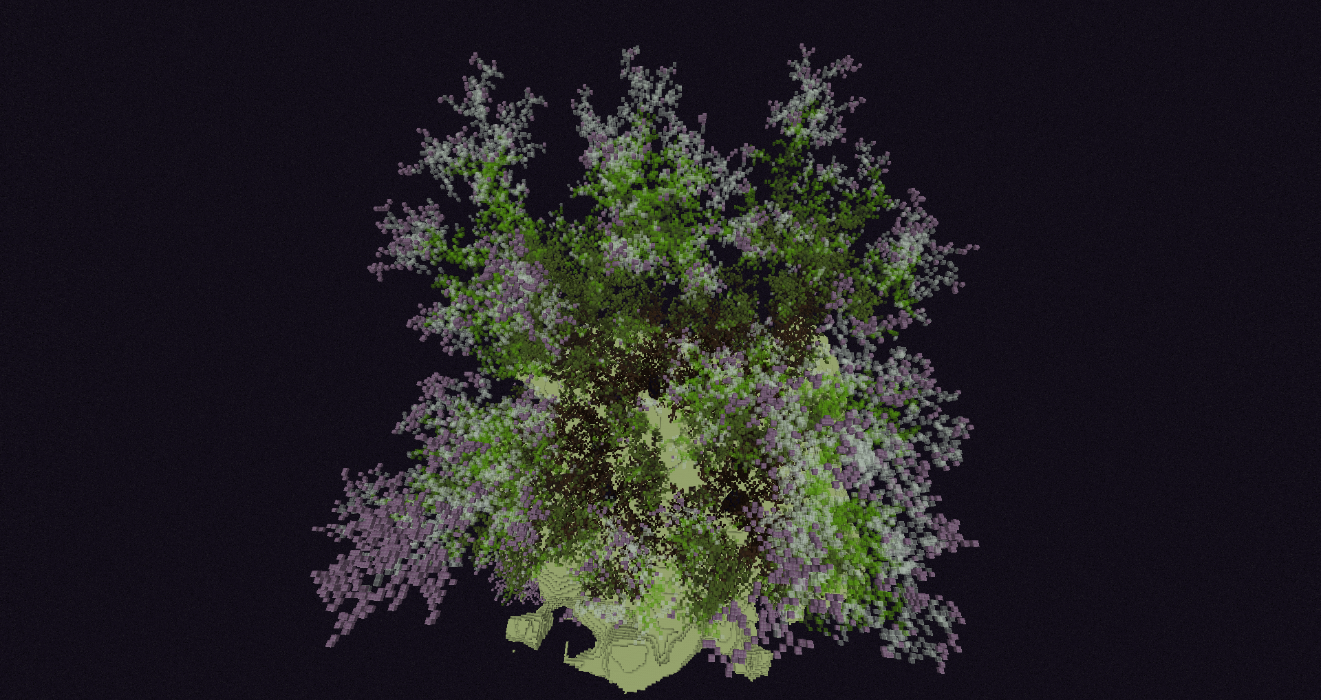 And, revisiting this idea much later, I wrote a feature for HBot that could simulate a 3D DLA in Minecraft for any parameters specified by the user, from the blocks that can act as a seed to the way the solution changes over time. After quite a bit of optimization to get it to run in a reasonable amount of time, here is an example of what you can produce with it: